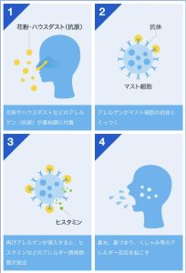 これにより鼻水やくしゃみ、目のかゆみが起こるのです。