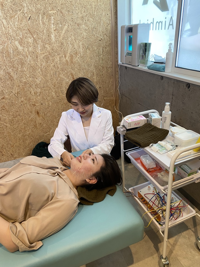 完全に身体緩んだ後、ピンポイントに表情筋に鍼を刺します